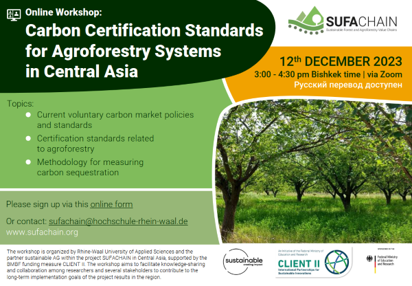 The workshop addresses current standards for the voluntary carbon market, certification standards in agroforestry systems, and methodologies for measuring carbon sequestration. The target group are stakeholders from science and practice in Central Asia.