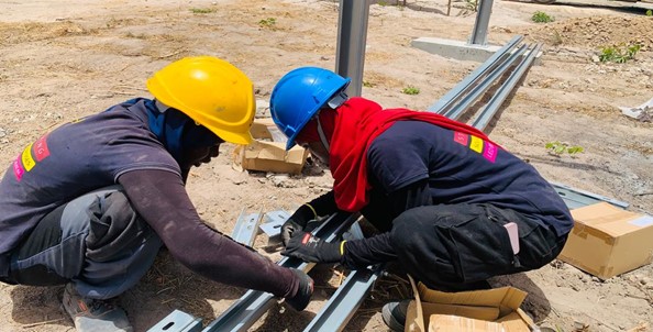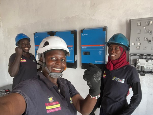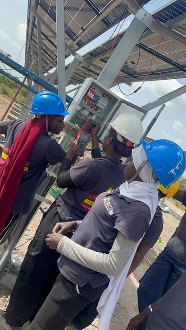 Die Pilotanlage bei Afri-Farms liefert nicht nur saubere Energie und Bewässerung, sondern ermöglicht außerdem jungen Mädchen in Gambia, im Bereich der erneuerbaren Energien tätig zu werden. Im Rahmen der Systeminstallation und des Wissenstransfers konnten junge Elektrikerinnen in Ausbildung von der Mbolo Association, einem der Projektpartner, eingestellt werden, um unter Aufsicht erste praktische Erfahrungen beim Aufbau der Systeminfrastruktur zu sammeln. Dazu gehören die Montage von Stützrahmen und die Verkabelung des Kontrollraums zur Vorbereitung der endgültigen Installation der Solarpaneele.