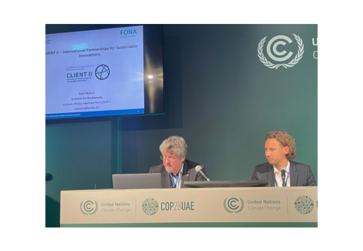 Im Pavillon der zentralasiatischen Staaten hatte die Deutsch-Kasachische Universität, Partner in mehreren CLIENT II Projekten, außerdem eine Session zum Thema „Assessing and Addressing Climate Change Impacts in Central Asia: Challenges and Solutions“ organisiert. In diesem Rahmen stellte Axel Paulsch vom Science-Policy-Interface ebenfalls die Fördermaßnahme CLIENT II, das Projektbüro CASIB und die Projekte KlimALEZ, PV2Heat und KendyrTex vor.