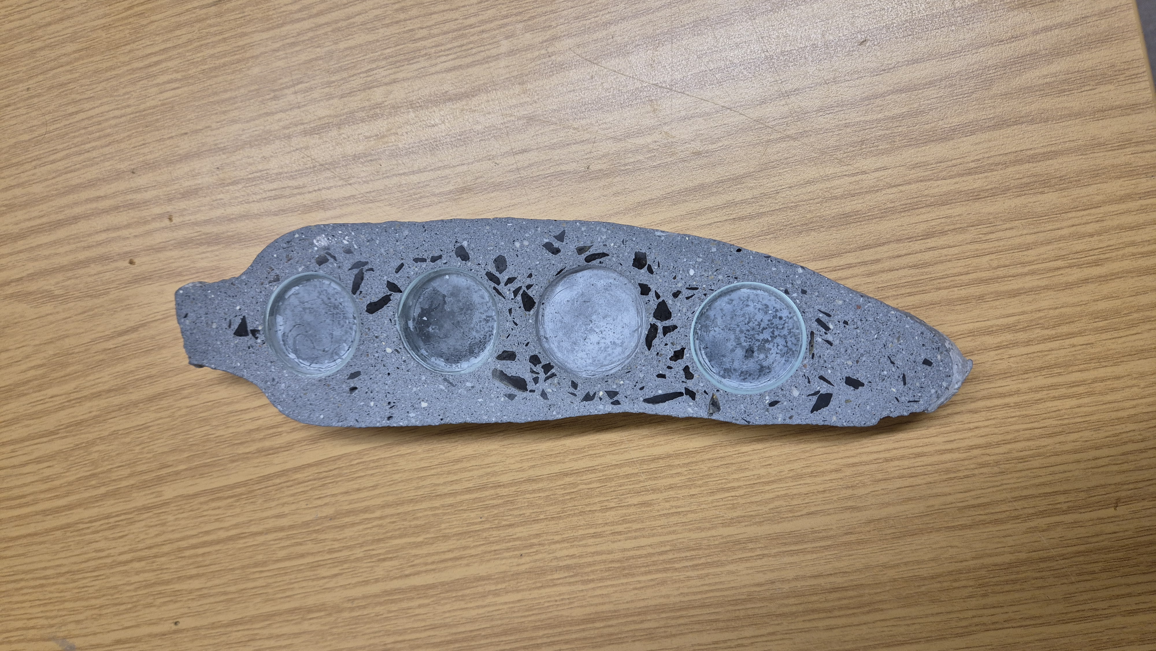 Das auf der CLIENT Konferenz 2024 ausgestellte Exponat zeigte einen innovativen Betonprobekörper in Form einer halben Cassavaknolle des Projekts INFRACOST. Die vier integrierten Kammern sind befüllt mit Cassavaschalen, Cassavastärke, Cassavakohle und Cassavaasche – den wichtigsten Verarbeitungsstufen der Cassava für nachhaltige Baustoffe.